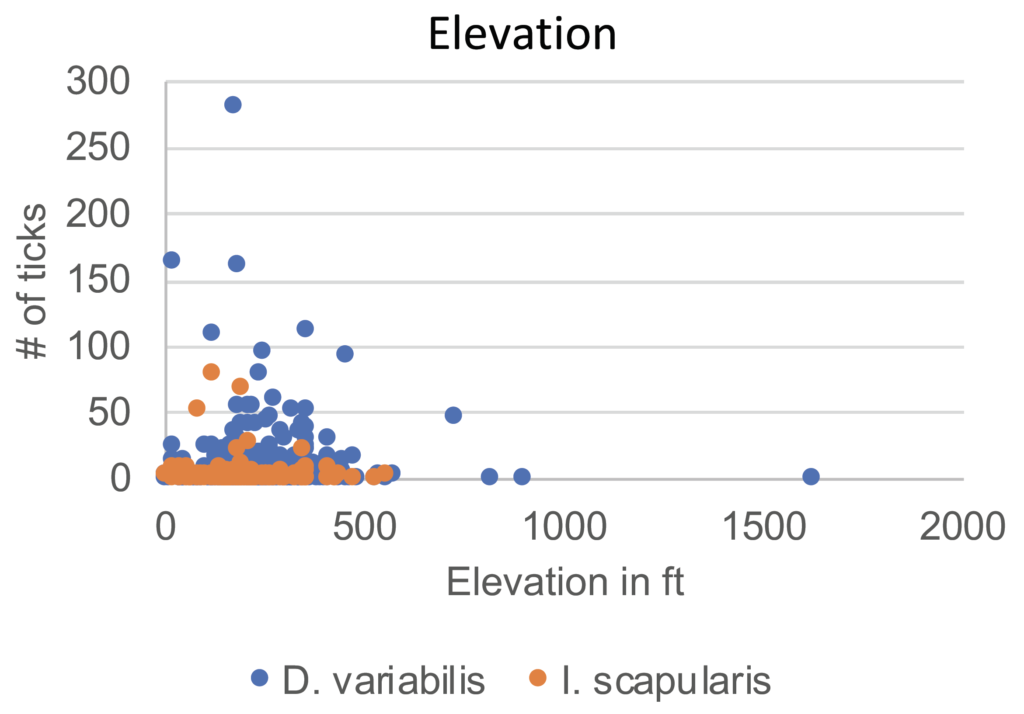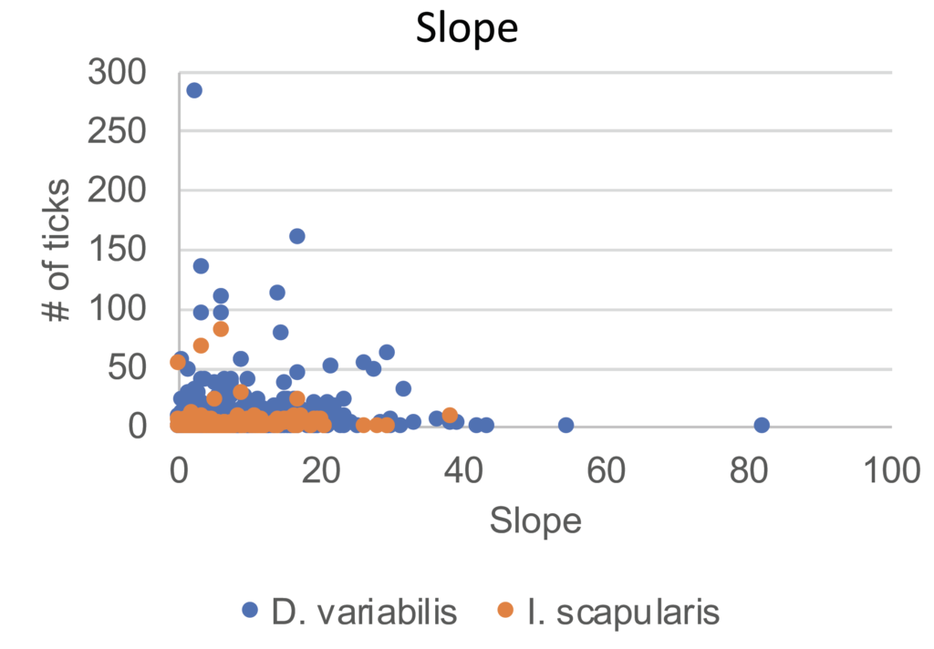 There is possibly no correlations with tick species and elevation, slope, precipitation and land cover, yet all data is not included, and statistical analysis has yet to be performed.
