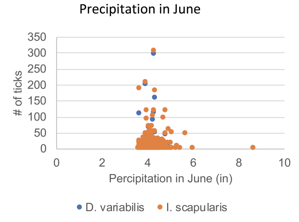 Dog ticks peaked in June and Blacklegged (deer) ticks peaked in May and October, corresponding with peaks of Lyme disease and somewhat anaplasmosis.