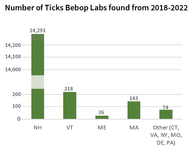 BeBop Labs collects most of its ticks from New Hampshire, but we have access to other states as well. We see a consistent and significant amount of ticks from year to year.