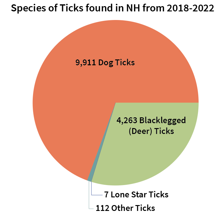 In New Hampshire, we see 50% less blacklegged (deer) ticks than dog ticks. Blacklegged ticks can carry Lyme disease. NH does have some Lone Star ticks (7 ticks collected in the past 4 years).